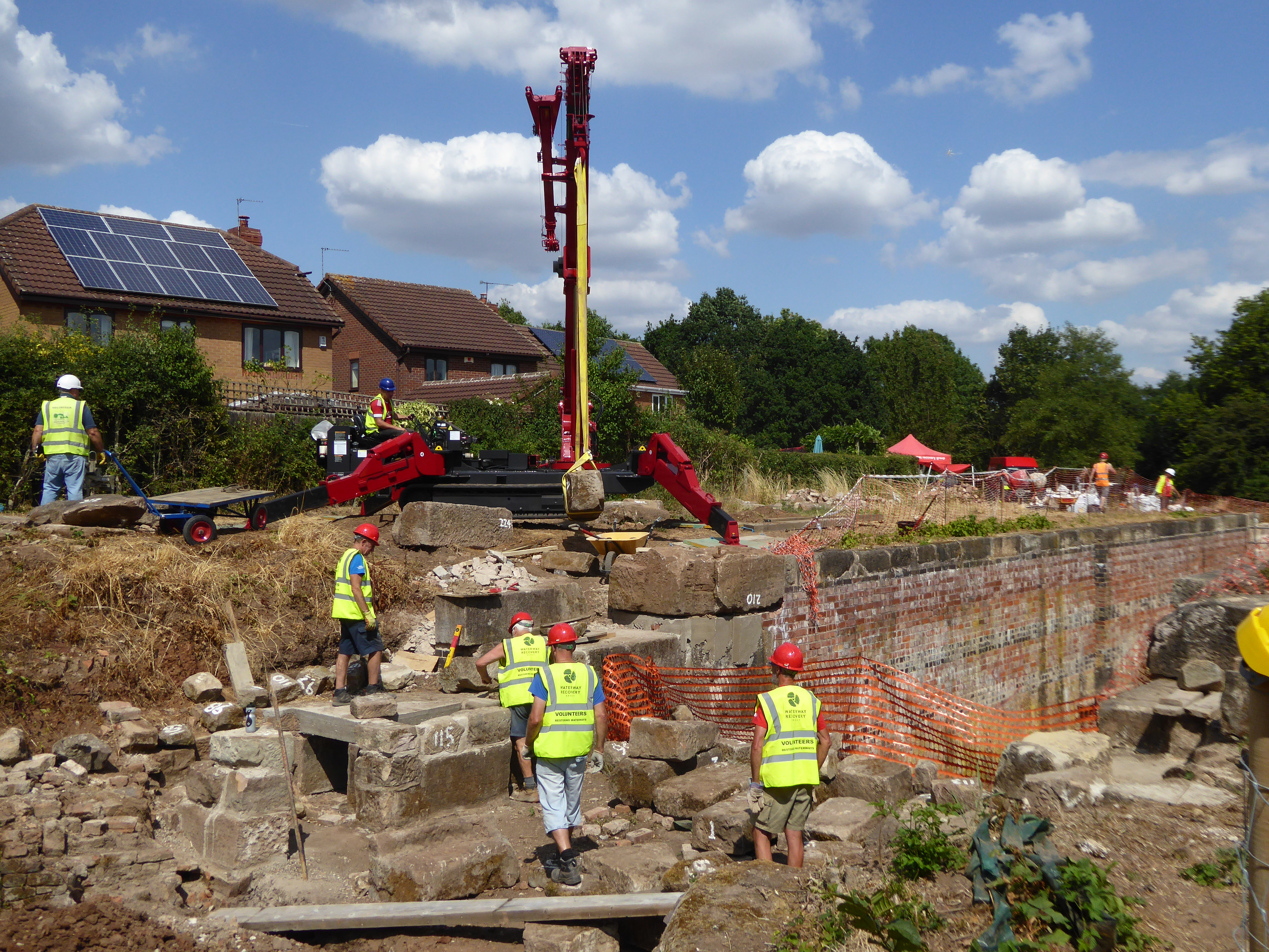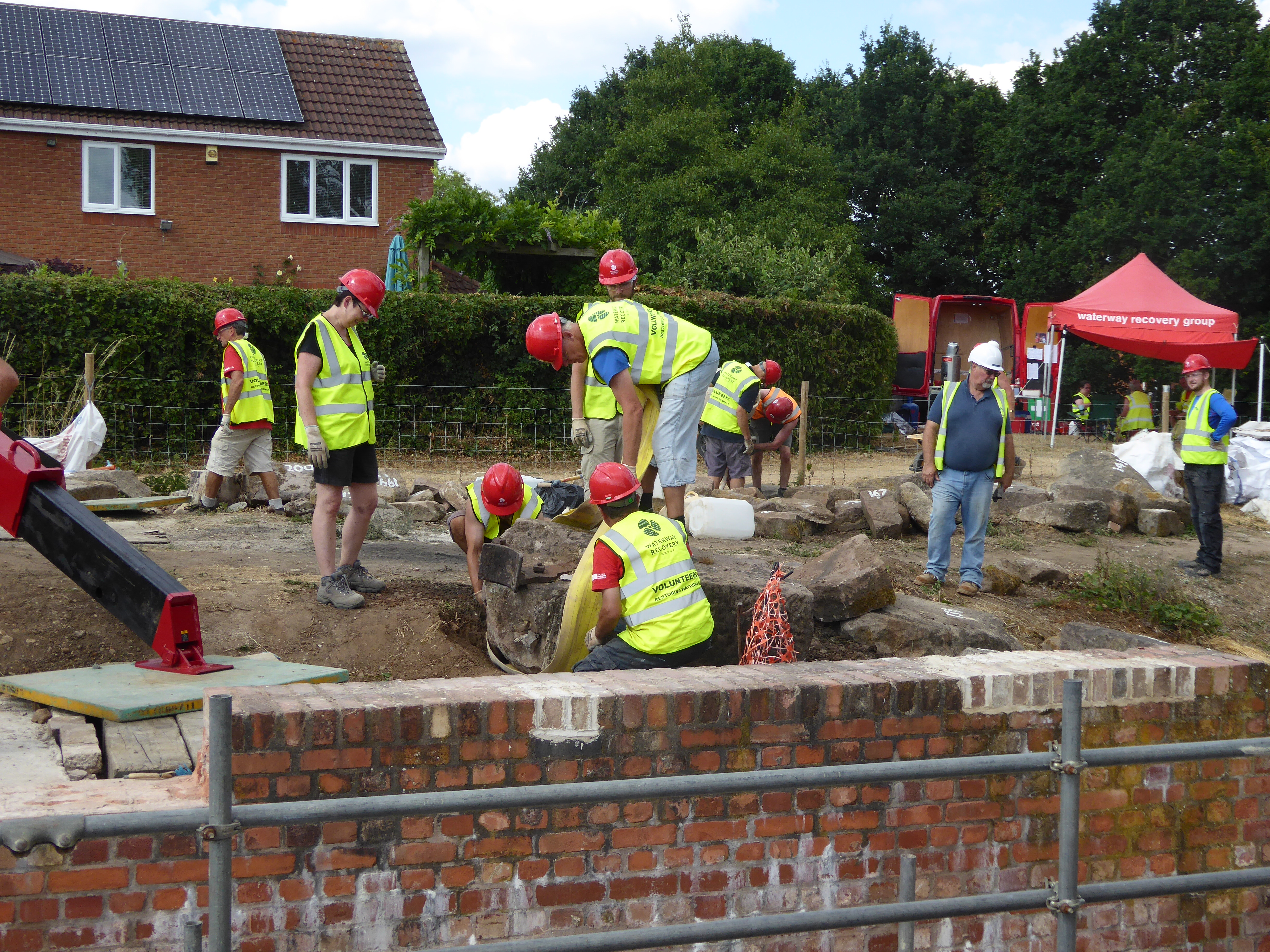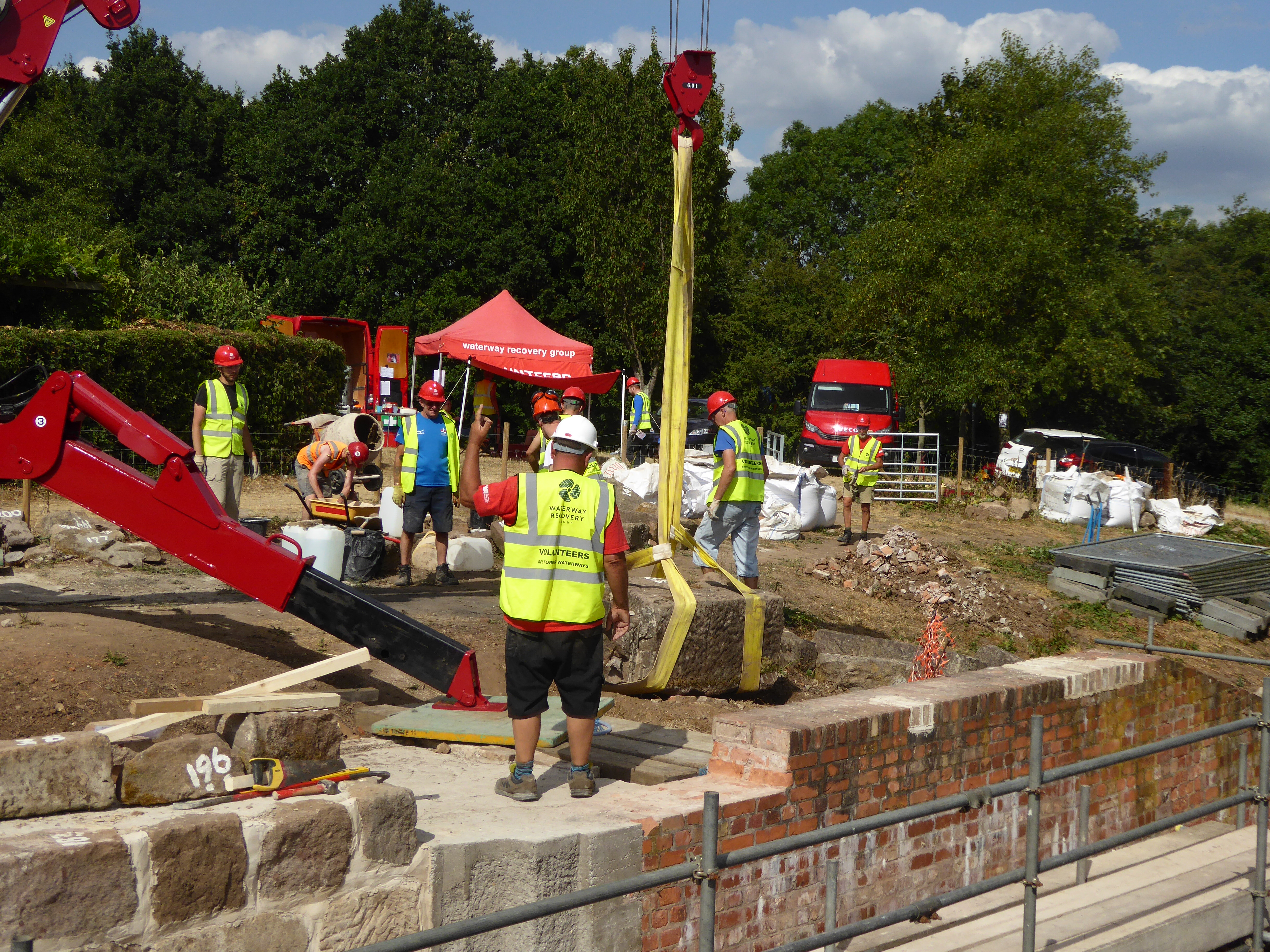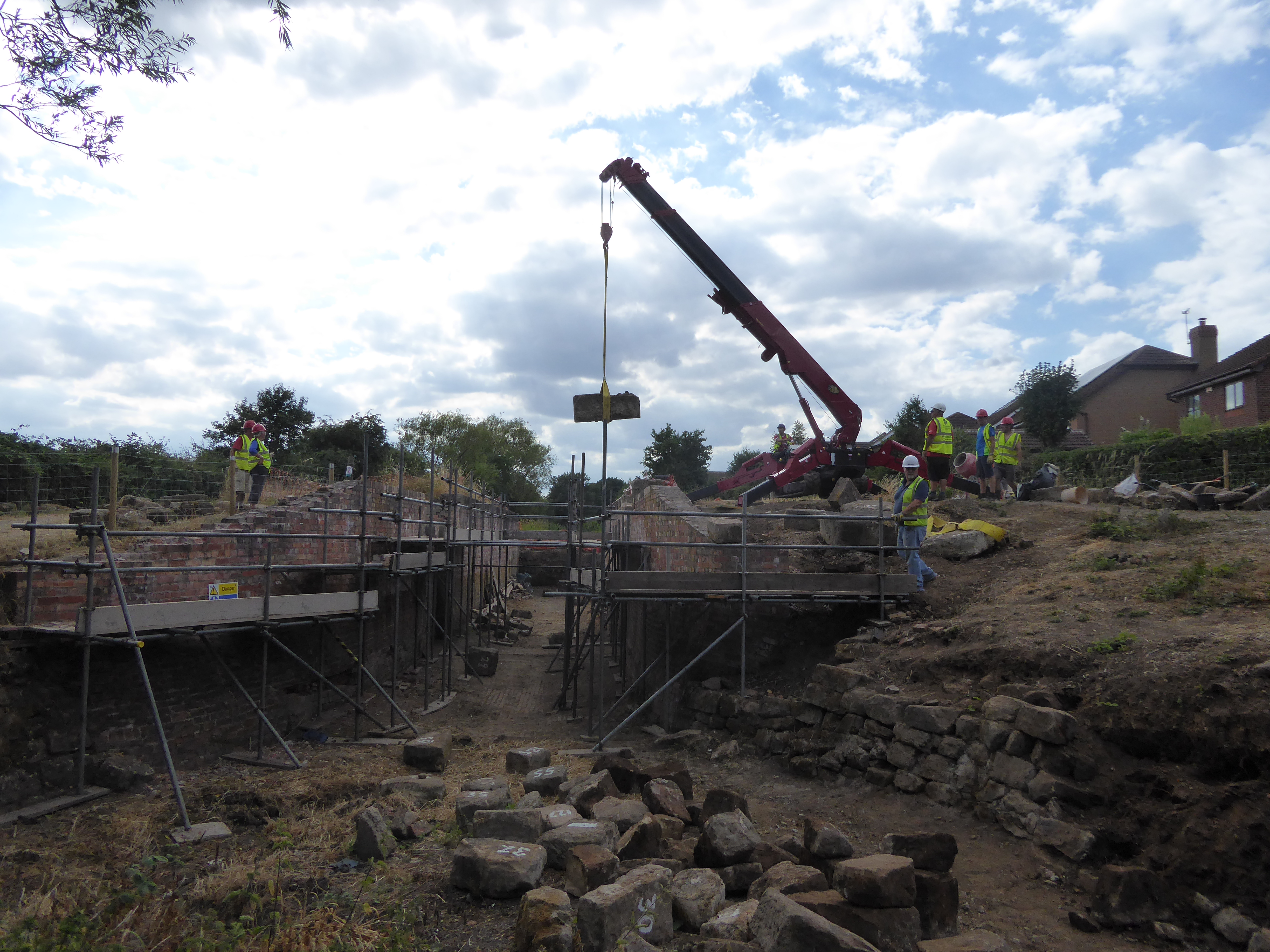 Waterways Recovery Group arrived on Saturday 21st July and started work in earnest at Borrowash on the Sunday morning. Great progress has already been made by the team of some 19 volunteers. A mobile spider crane arrived on Monday to lift large stone blocks, some weighing up to 2.5 ton. Over the week we anticipate that all the large stones that were previously displaced will be returned to their rightful place.