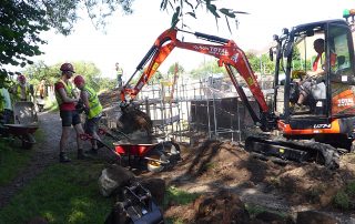 Despite searing heat our friends make good progress at Borrowash Bottom Lock, pictures depict the movement of infill from below the lock chamber to behind the freshly built up wing walls.
