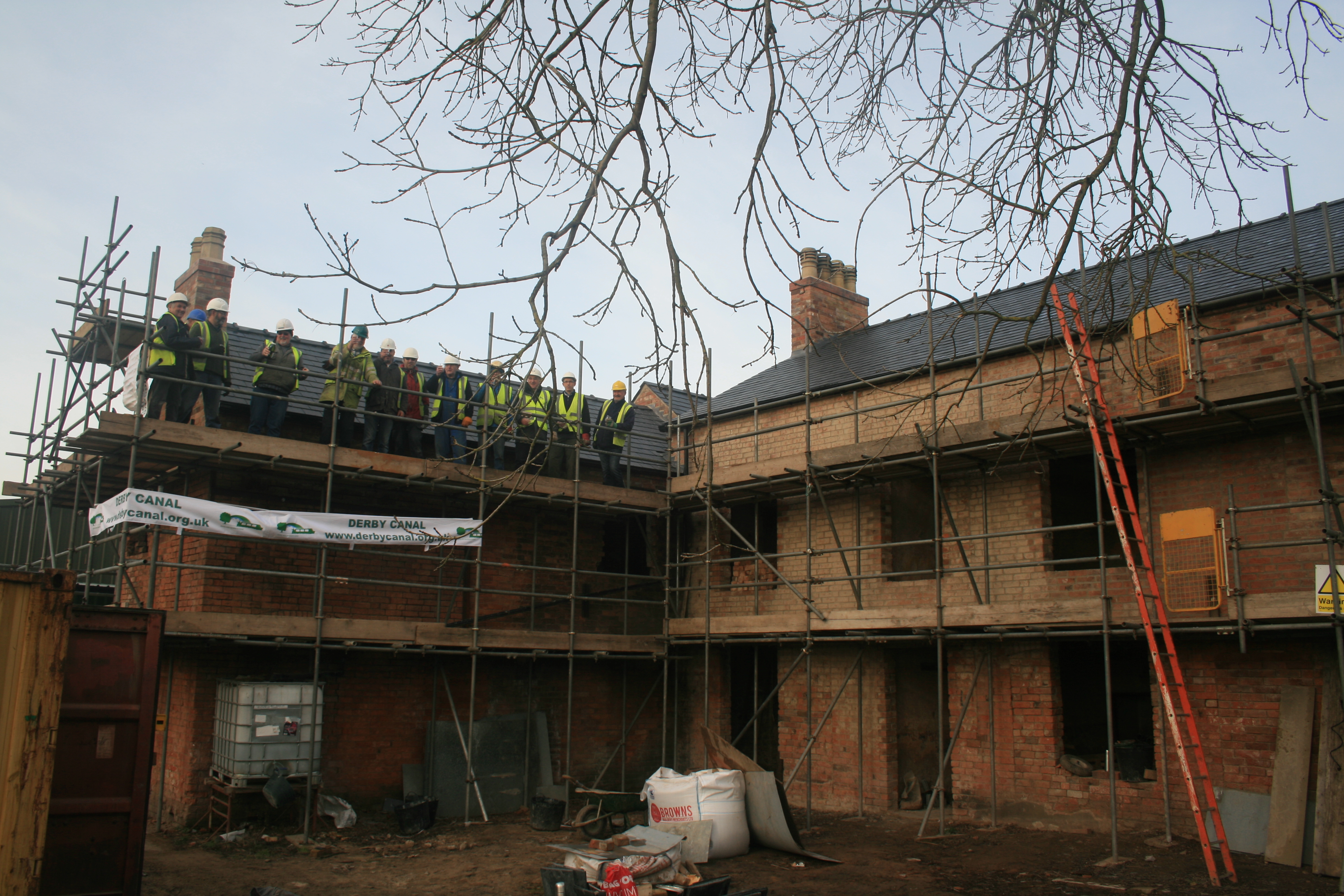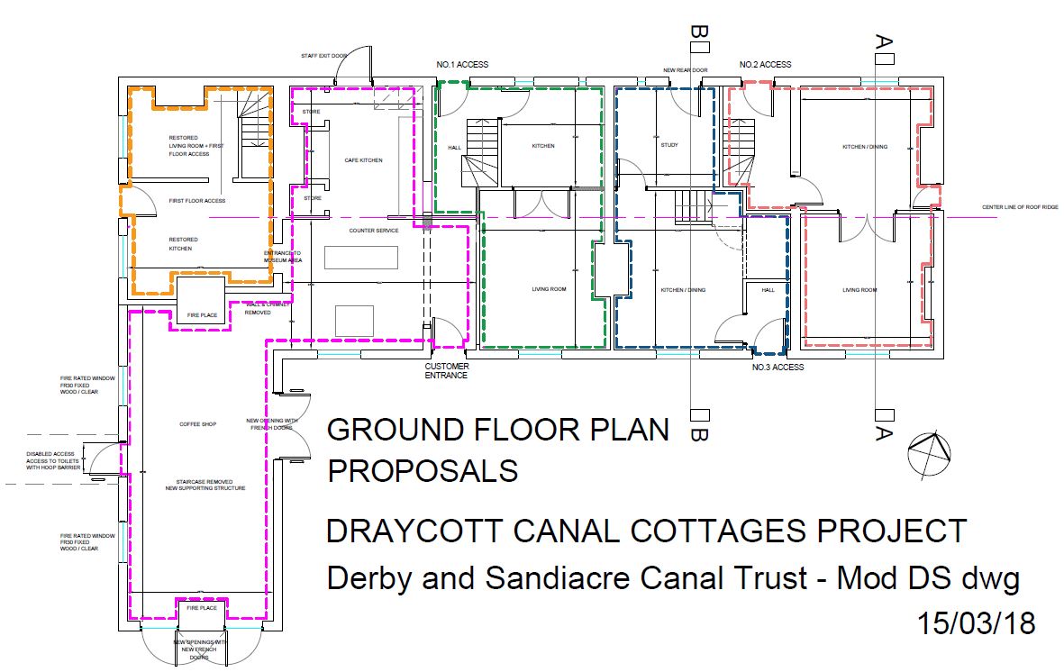 Plans were drawn up to restore the building, creating a mixed residential and commercial complex (see the plan to the right of the page). The residential side is three cottages, a two bedroom, one three bedroom and one four bedroom – accommodation spread over three floors in all three cottages. The ground floor of the commercial section will be a café (kitchen, reception and seating areas), with the upstairs initially used as offices/meeting rooms. There will be room downstairs that will be turned into a museum for the Trust to display pictures and artefacts. The museum room and one of the offices are to be used to provide a base for the Trust to showcase the heritage of the cottages and the wider Derby Canal. It is hoped that in the long term, the site will form a base for activities and canal line services, e.g., shower, changing room, café.