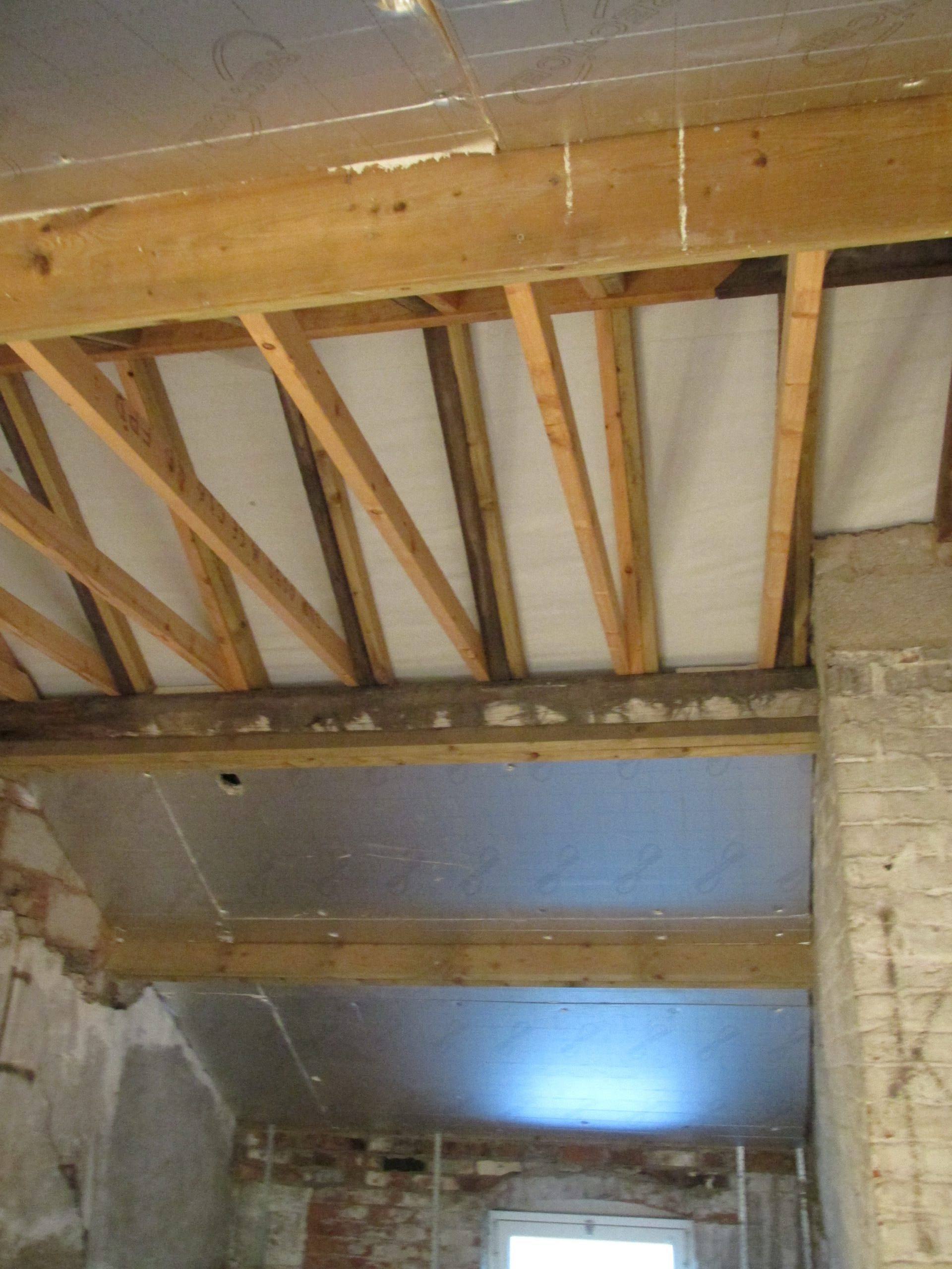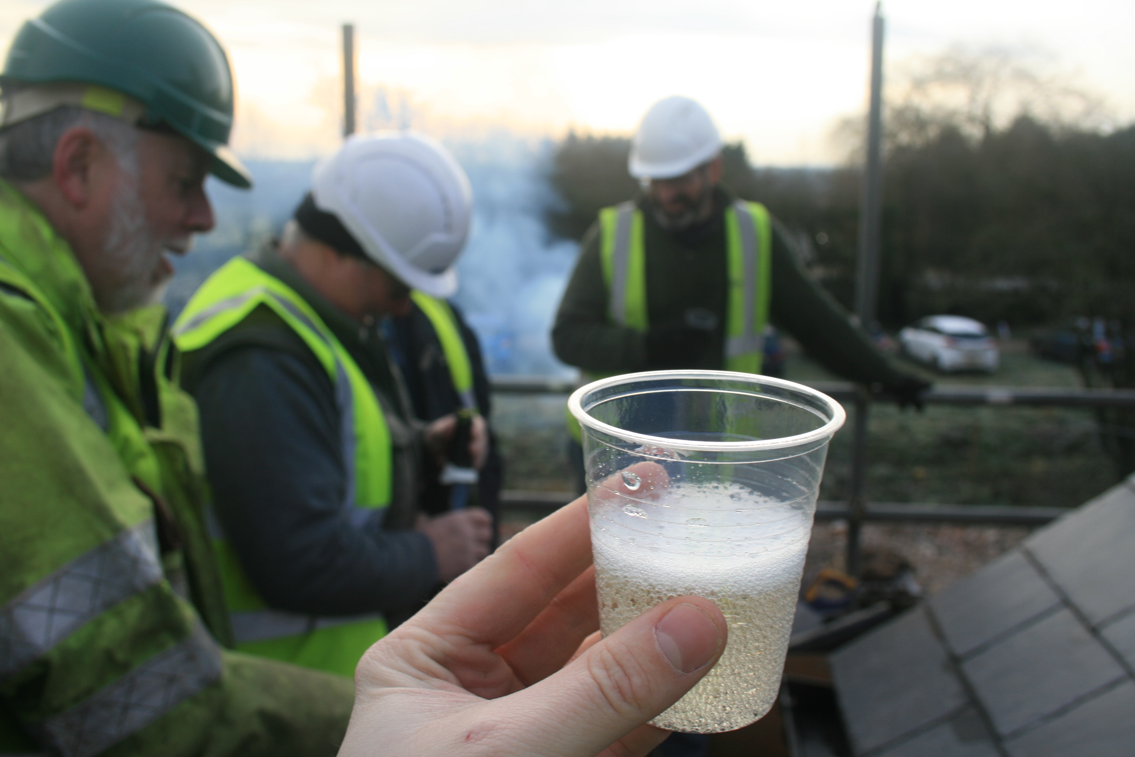 - All the old roof tiles were removed to provide access to the whole building. New roof timbers were installed, where needed, and the whole roof was tiled using new slates. The roof was completed in November 2019, when we held a Topping Off ceremony.