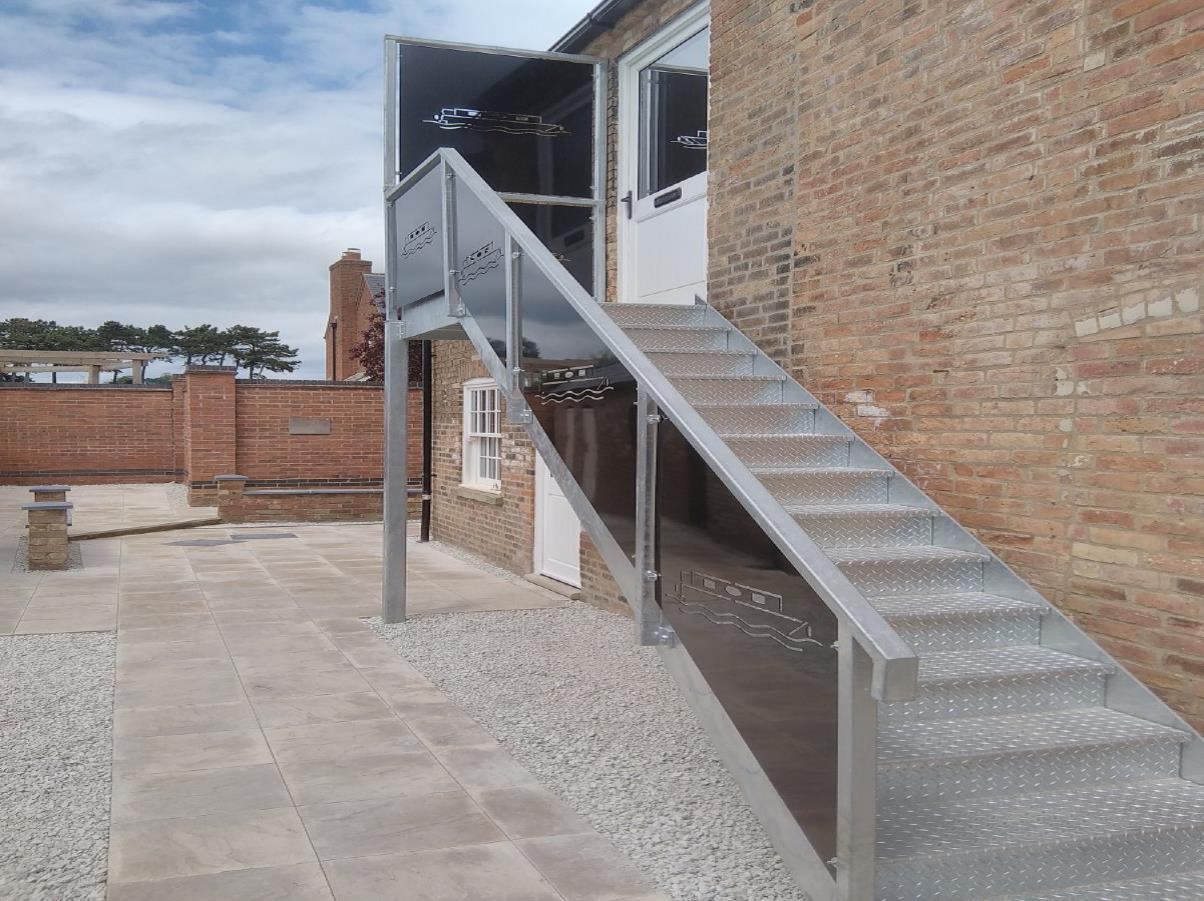 The café is also moving forward with floors almost complete and all the external doors fitted to the main building. And our external stairs have had the panels fitted – designed by David they show narrowboats — as you can see.