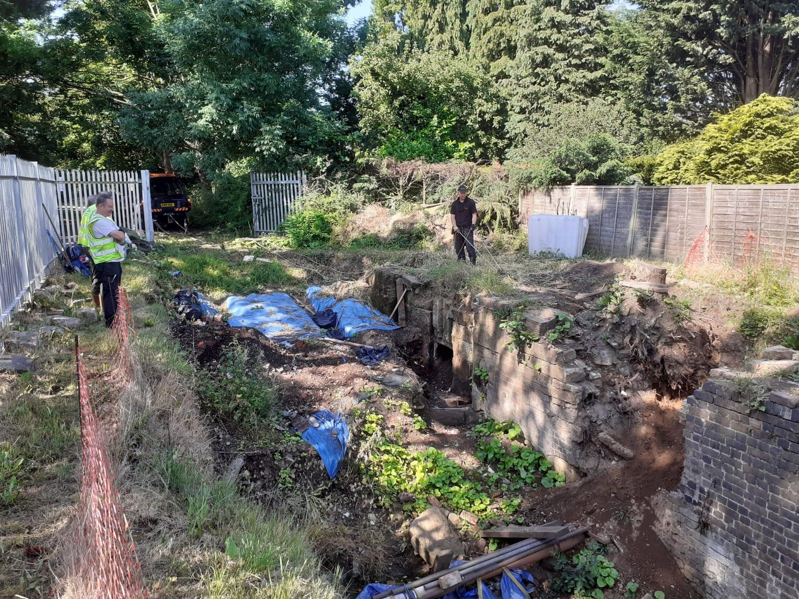 With the cost of sewer diversion estimated at £200k we have been working to reduce that number with a reasonably helpful Severn Trent water management. Key to that is understanding what state the south wall is in. Would it collapse if we dug a trench behind it? Is there room for a sewer or are there buttresses to negotiate?