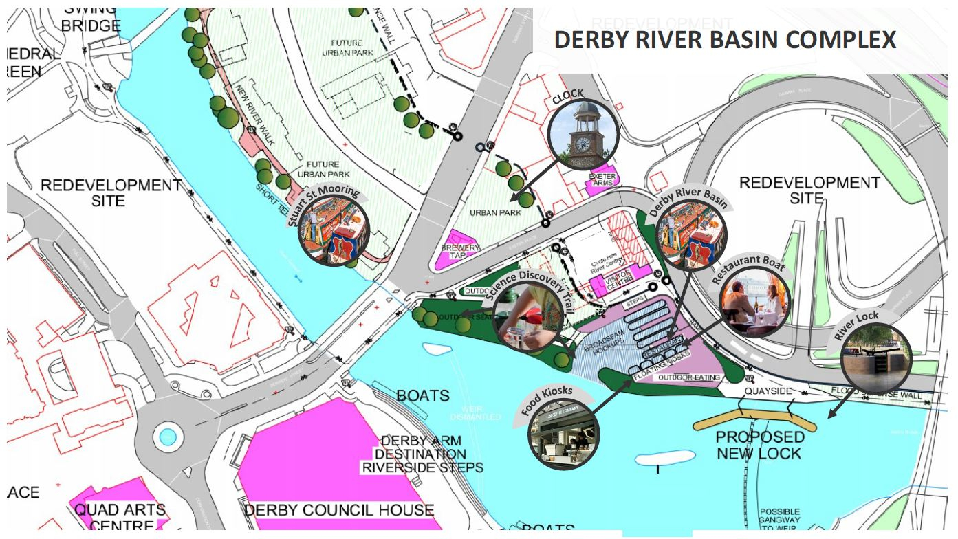 As you’ll know all local authorities are keen to revitalise their city centres following the epidemic and Derby city is keen to open up the river as an attraction. We have been consulted at a high level and have proposed ideas included in the diagram below. We have a broad promise to fund a study by Atkins on these and other ideas and are hopeful that we may have a means to promote the lock through the Long Bridge weir. So watch this space as it could mean a significant and very visible step forward in a few years time.