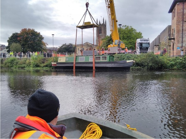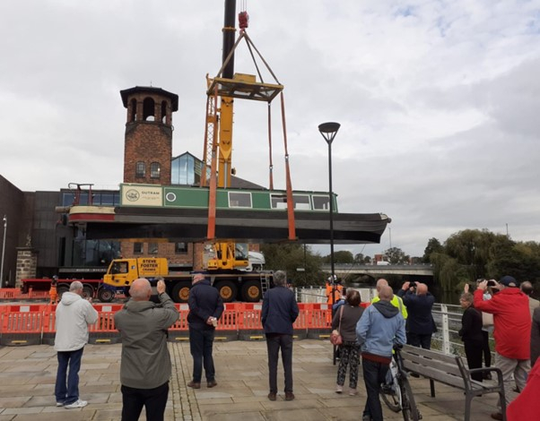 At long last we have achieved the launch of the Outram. It shows the impact of deadline management. We set the date of Thursday 14th and everyone seemed to get organised to achieve it. We had a few scares on the way – would the transport, crane and protective matting all happen as and when they should?, would the press turn up?, where would we get a suitable small boat to take passengers to Outram when launched? (H&S prevented travelling on the Outram of course), would we be able to get safely transferred onto Outram from the small boat? (we don’t want the wrong sort of publicity!).