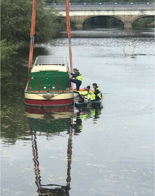 Most of concern was that the sonar survey of the river bottom carried out by the council showed a number of underwater obstructions that “should be deep enough” and a bar across the river just before the mooring jetty in Darley Abbey. These hadn’t shown up on the initial testing by Midland Canoe Club three years before, so we were able to use the small boat commissioned for the launch to carry out last minute depth testing on the day. Fortunately these showed the challenges were not as great as suggested and we were able to proceed with contingency plans a the ready. The testing at the Darley end showed that water depth was just about enough, even in the current low water state of the Derwent. However we are now looking at how to ensure that even lower waters don’t trap the boat on the jetty over the winter and will be undertaking work to mark the safe route through.