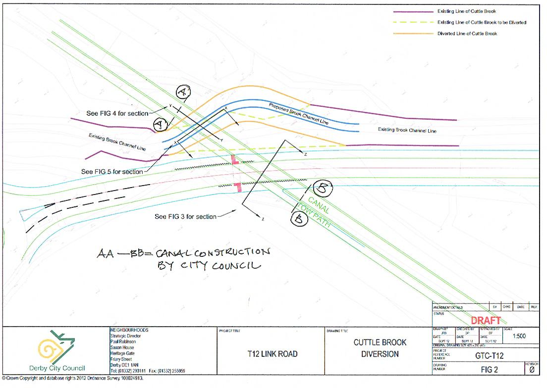 Whilst Infinity Park Way was originally constructed at ground level across the route of the Derby Canal, with the Trust’s agreement as a temporary measure there is provision for the road to be replaced by Derby City Council with a road bridge over the canal which in turn will cross the Cuttle Brook that runs adjacent to the road. The top right image shows part of the detailed design for the new road crossing.