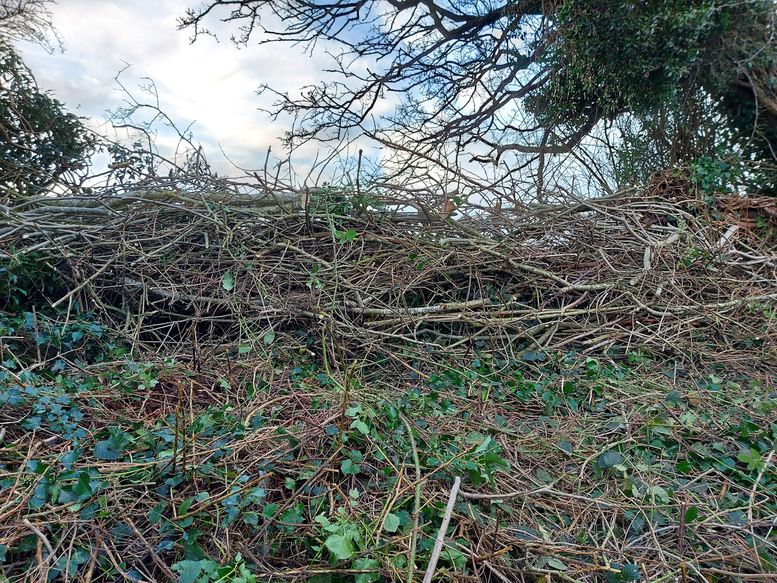 To further define the canal channel the Trust’s volunteers have commenced the removal of poor-quality trees from within the channel. The core of a number of the cracked willow trees were found to be rotten making them susceptible to falling. With a number of more valuable trees being at risk from being overwhelmed by ivy the ivy has been cut from these finer specimen trees to try to extend their life. Dead hedges which get great reviews from environmentalists as they provide much needed cover for small mammals and birds have been constructed by piling thinner branches and other brash on the west bank. They are great for fungi and insects, which then provide food up the food chain. The Trust now have these dead hedges at Sandiacre, Borrowash and now Chellaston. The hedges are easier and quicker to construct as opposed to the use of a shredder, which of course is using diesel fuel.