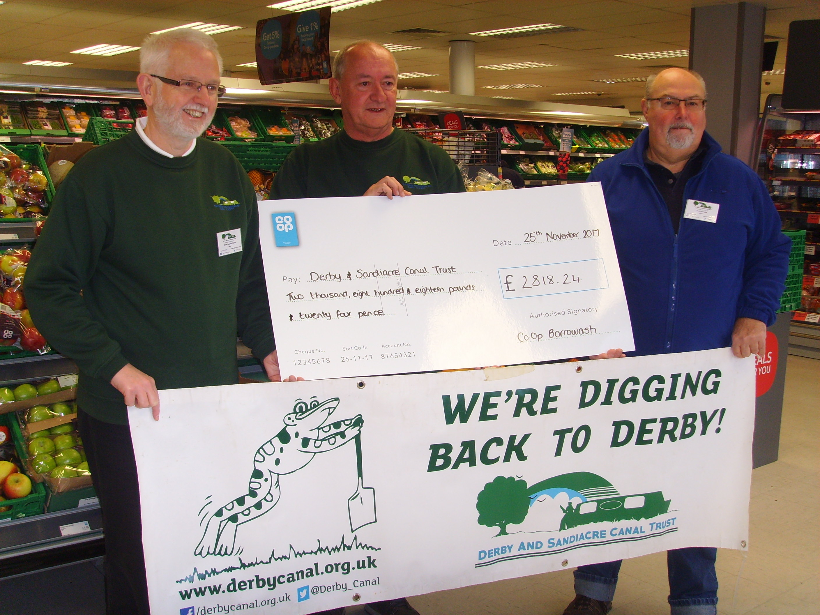 Following the latest round of Co-Op Local Community funding, the Derby and Sandiacre Canal Trust is pleased to announce that it has received £2818.24 from the Borrowash Store as one of three supported charities.