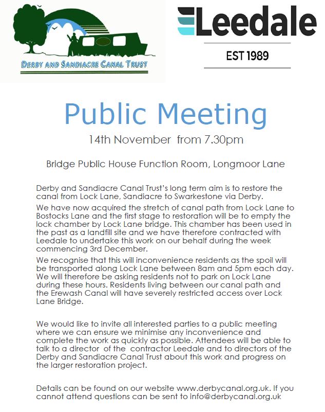 We would like to invite all interested parties to a public meeting where we can ensure we minimise any inconvenience and complete the work as quickly as possible. Attendees will be able to talk to a director of the contractor Leedale and to directors of the Derby and Sandiacre Canal Trust about this work and progress on the larger restoration project.