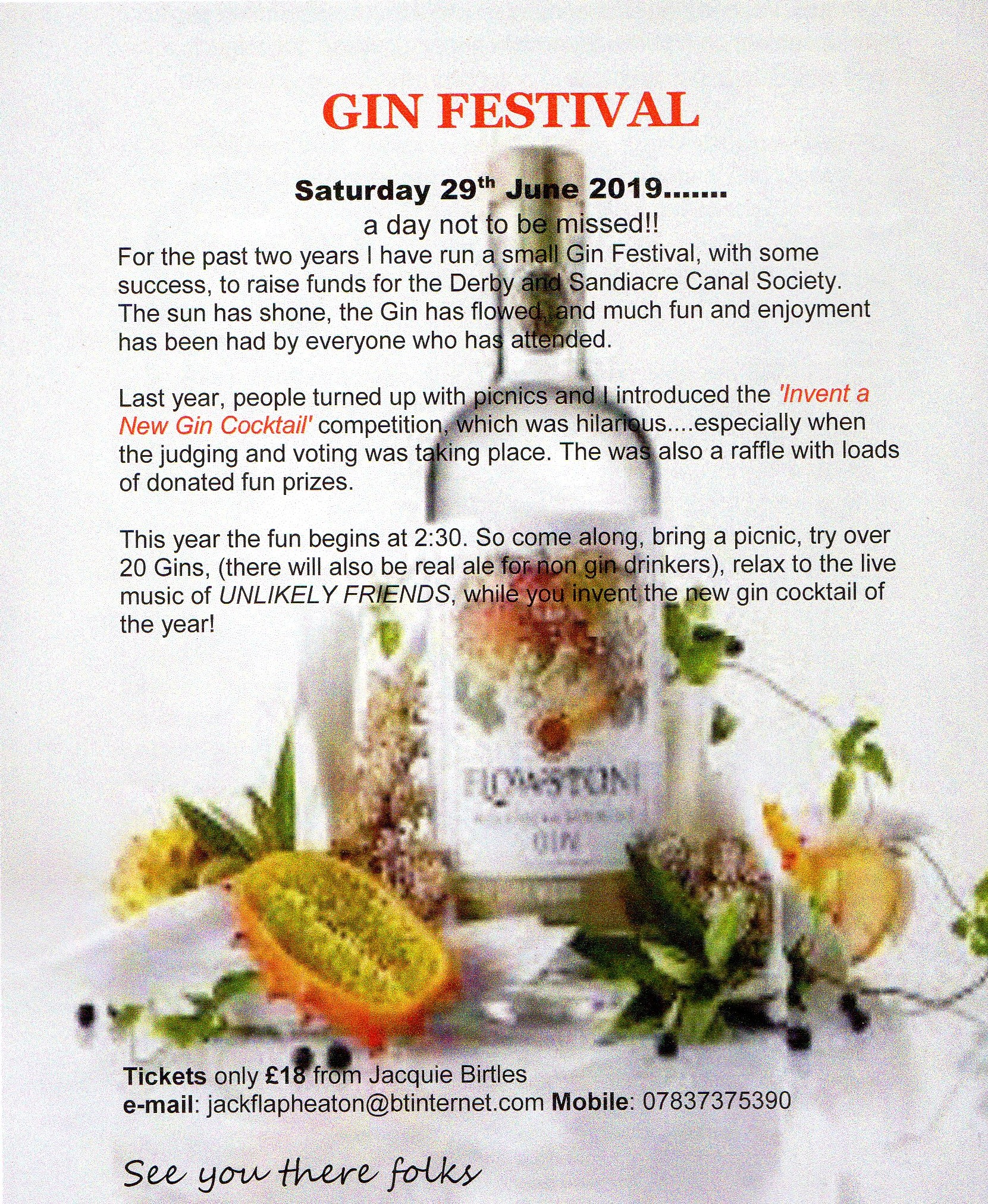 Gin Festival to be held at the Birtles residence in Sandiacre on June 29th 2019, tickets are £18, with all profits going to the Society.
