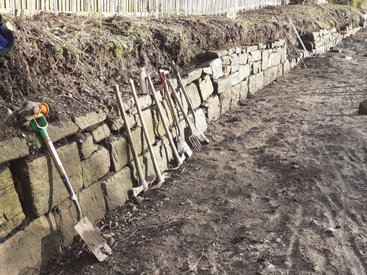 Whilst the weather has claimed a few cancelled working parties recently good progress has nevertheless been made with the main thrust at Borrowash where the restoration of the banks by Station Road has progressed rapidly. We have been lucky to be offered the blocks from a Nutbrook Canal bridge that needed to be moved. The development of Stanton Ironworks is now progressing so when we were approached by a director at Wards Recycling to ask if we wanted the blocks so they could clear the site we said yes please. And they offered to load up the blocks as well for us to transfer to be used in the wall at Borrowash. Unfortunately there was no practical option to use the stones as a bridge- the obvious candidates have already been restored. The teams had already planted out trees/whips along the boundary on the off bank. So with the pulling of stumps on one side and wall building on the other the line is really taking shape.