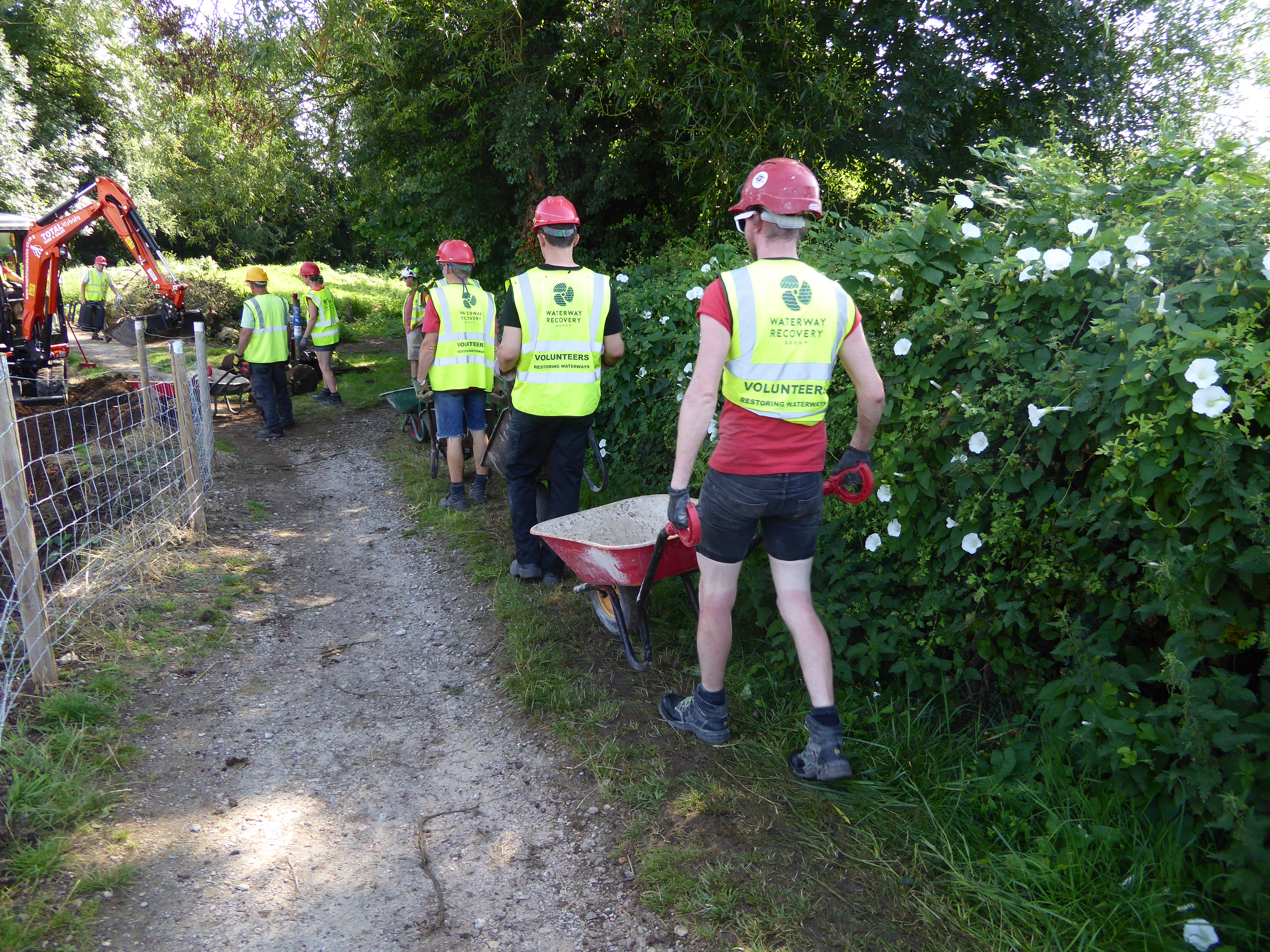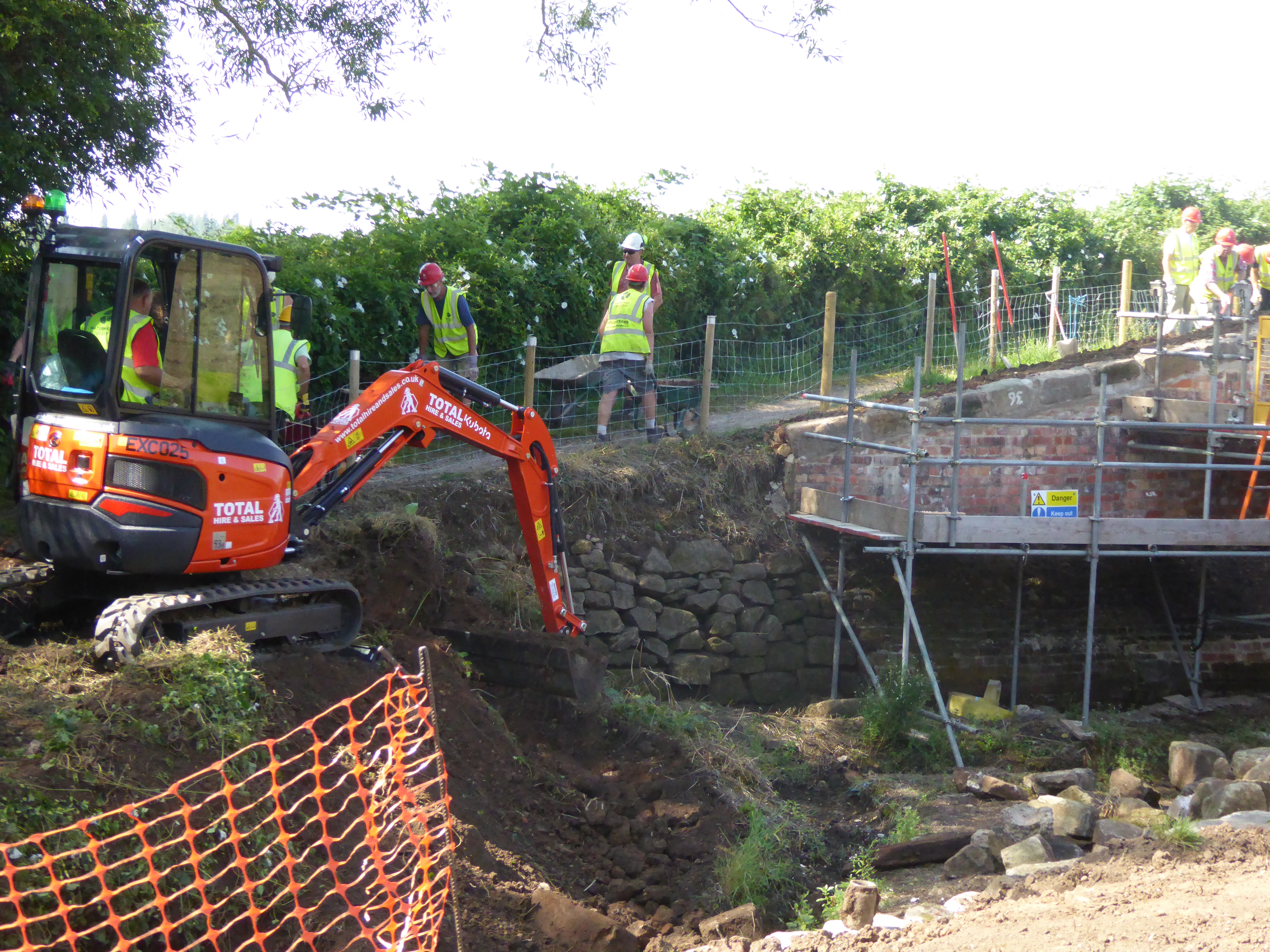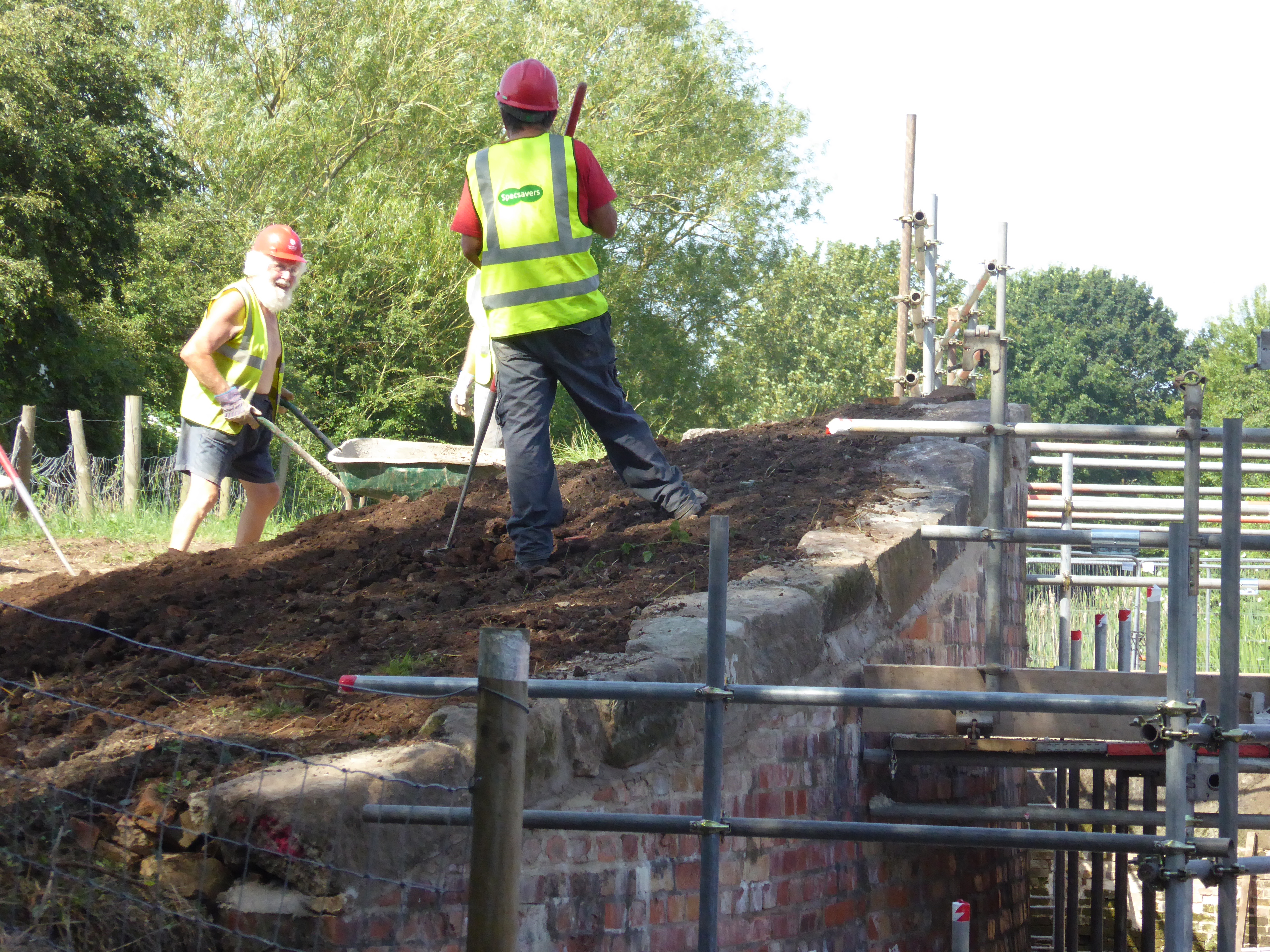 Despite searing heat our friends make good progress at Borrowash Bottom Lock, pictures depict the movement of infill from below the lock chamber to behind the freshly built up wing walls.
