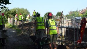 Despite searing heat our friends make good progress at Borrowash Bottom Lock, pictures depict the movement of infill from below the lock chamber to behind the freshly built up wing walls.